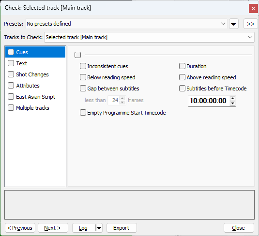 Once the subtitles are finished, you may want to verify there aren't any errors left behind. The Checks command will help you to locate all subtitles that doesn't match certain rules.